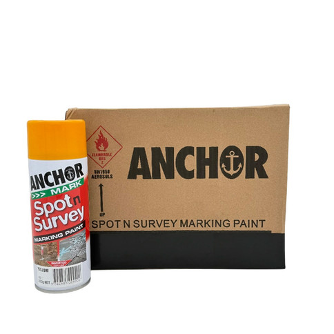 The Anchor Spot N Survey - Yellow 350Gm Box is a high-visibility marking spray designed specifically for surveying and general marking purposes. This product provides a reliable way to clearly mark various surfaces in the field. Its formulation ensures high visibility, making marks easily discernible. The convenient 350 gram spray can be used for professional or personal projects requiring precise and visible spot marking.