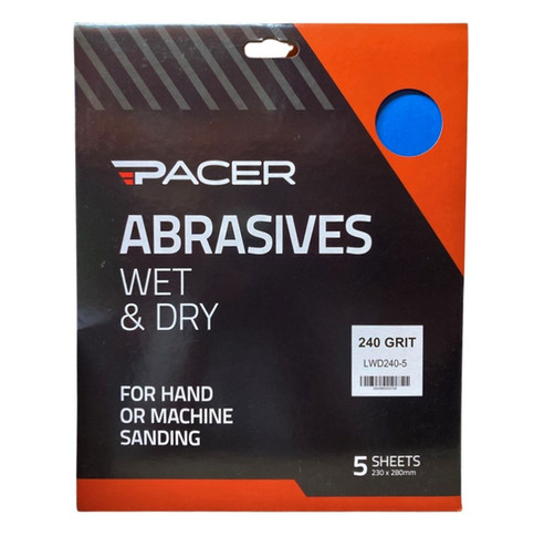 This Pacer Wet & Dry 240G - 5 Pack consists of five abrasive sheets specifically designed for wet or dry sanding applications. Each sheet features a fine 240 grit, making this pack ideal for detailed and precision sanding projects. These versatile abrasive sheets are perfect for achieving smooth finishes across various materials. The 5-pack size ensures you have an ample supply for your specialized sanding needs.