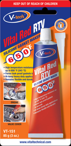 V-Tech Vital Red RTV is an original gasket maker specifically formulated for high temperature and heavy-duty applications. This 85-gram product creates reliable "formed-in-place" gaskets that effectively resist cracking, shrinking, and migration often caused by thermal cycling. It is an ideal solution for replacing virtually any cut gasket, and can also be used to coat pre-cut gaskets to enhance their reliability. The sealant is permanently flexible and stable across a wide temperature range, from -62 °C to 343 °C intermittently, and offers strong resistance to common automotive fluids.